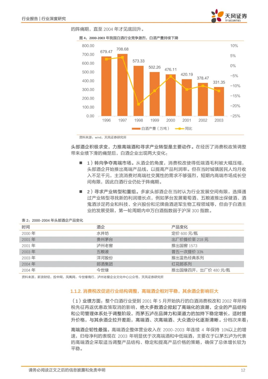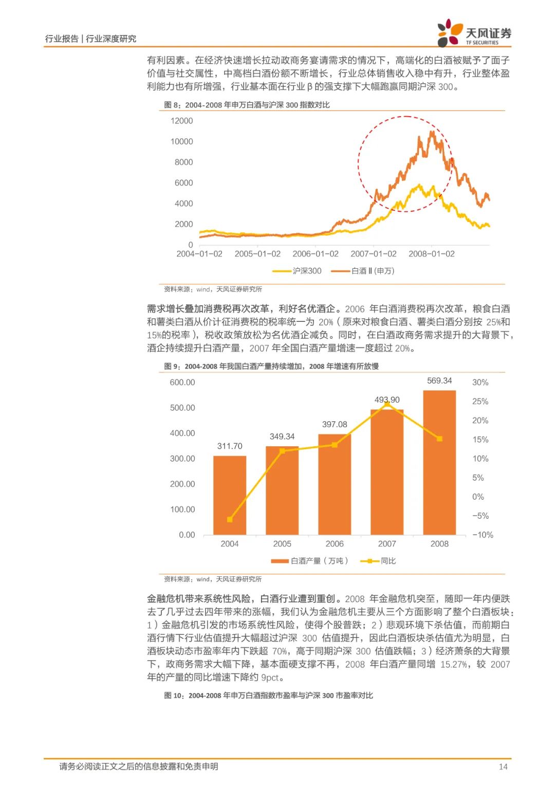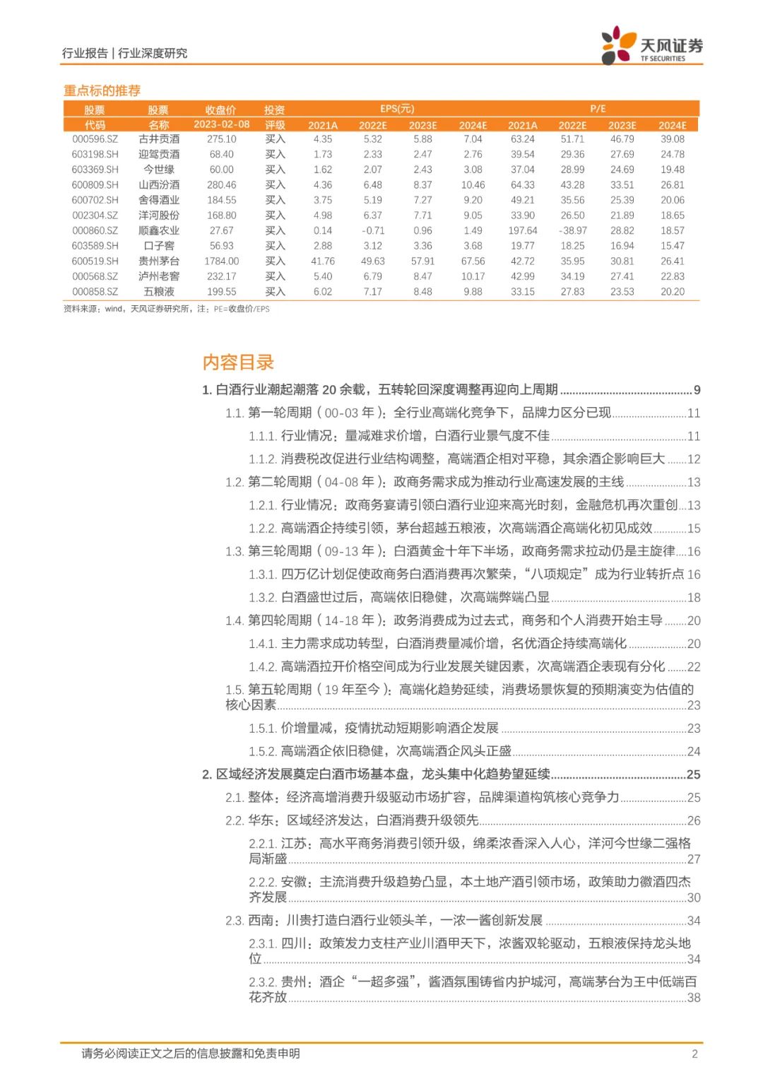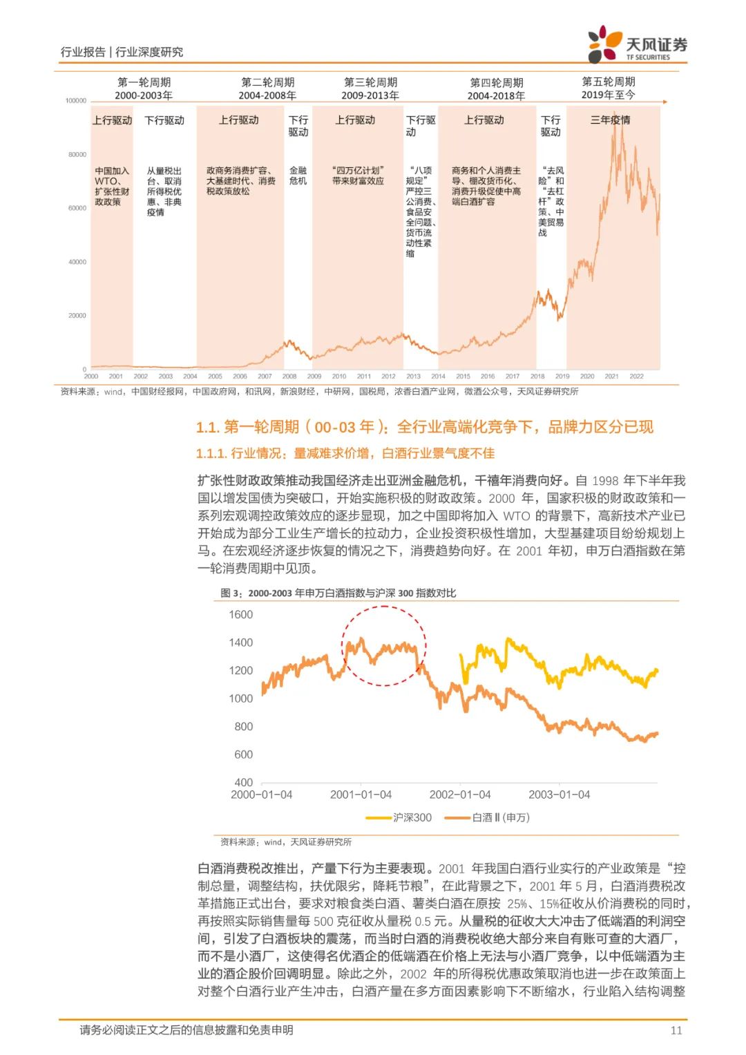 20 余载历经 5 轮周期:1)00-03 年,多数酒企顺应时代发展以及政策因素开始了产品结构和管理体系的调整,品牌力区分出现;2)04-08 年,政商务需求推动行业高速发展,次高端酒企高端化初见成效,名优酒企充分受益,08 年金融危机系统性风险增强下行业重回调整期;3)09-13 年,四万亿计划带动白酒消费量价齐升,限制三公消费出台催化行业转折,盛世过后高端依旧稳健;4)14-18 年,商务及个人消费取代政务消费主导需求转型,消费升级背景下,行业量减价增、高端化、品牌化成发展趋势,高端酒拉开价格空间推动行业上行,17-18 年“去杠杆”叠加“中美贸易战”,实体经济下滑驱使白酒消费受挫;5)19 年至今,疫情扰动短期影响酒企发展,行业价增量减趋势下,高端化道路延续,随着疫情防控的优化以及经济企稳恢复,行业估值&业绩有望逐季度加速恢复再攀高峰。