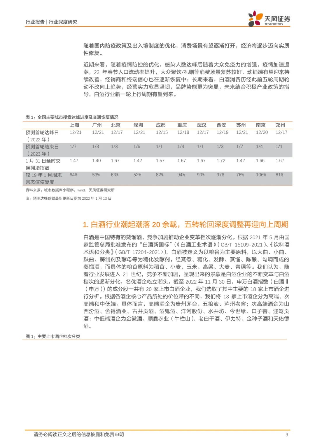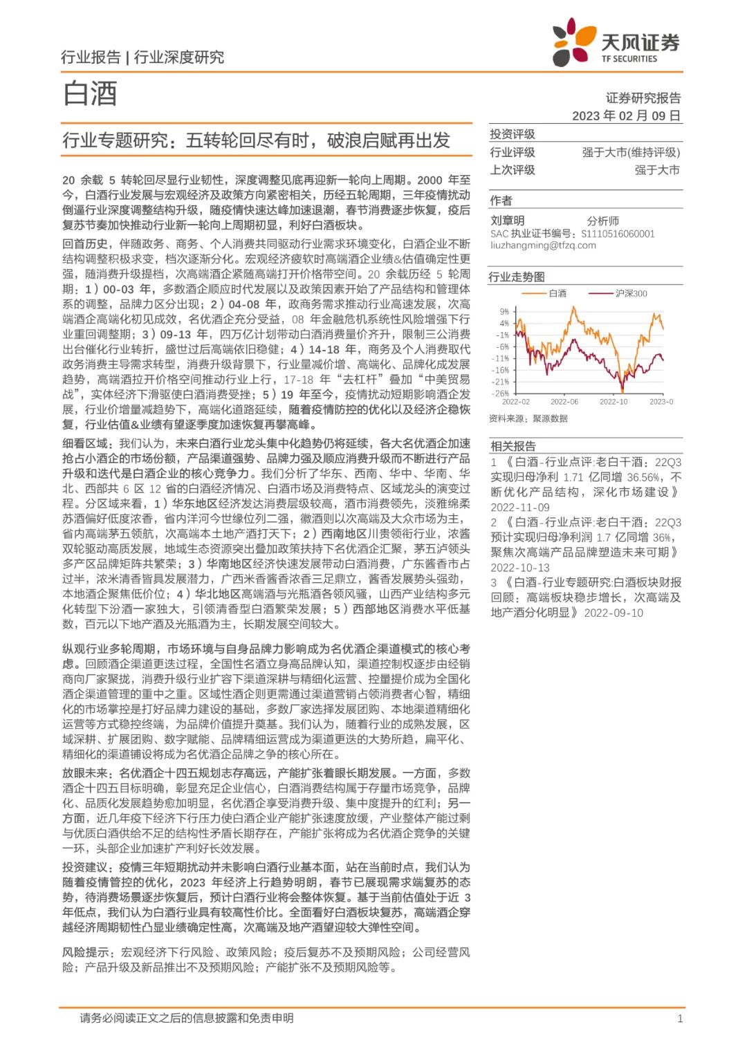 20 余载 5 转轮回尽显行业韧性,深度调整见底再迎新一轮向上周期。2000 年至今,白酒行业发展与宏观经济及政策方向紧密相关,历经五轮周期,三年疫情扰动倒逼行业深度调整结构升级,随疫情快速达峰加速退潮,春节消费逐步恢复,疫后复苏节奏加快推动行业新一轮向上周期初显,利好白酒板块。