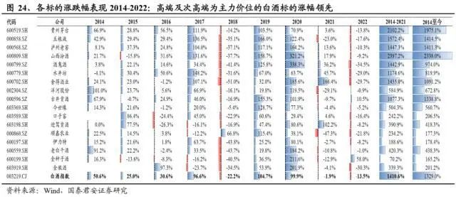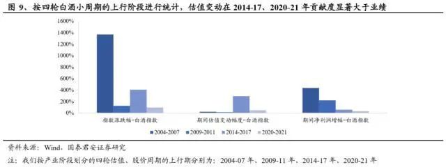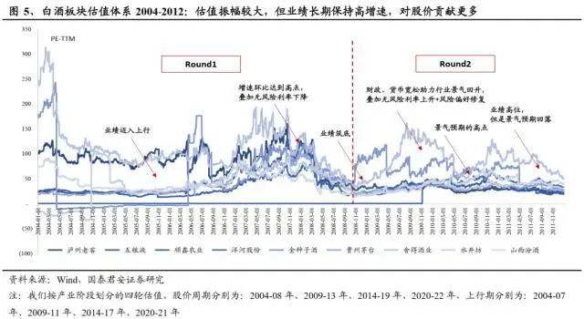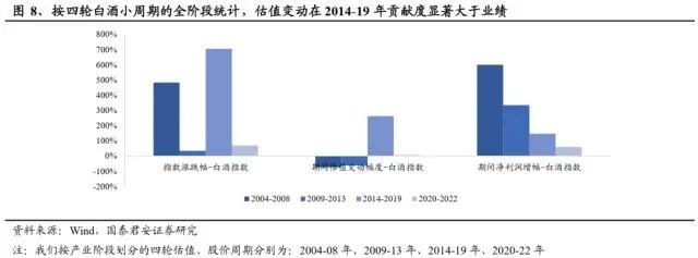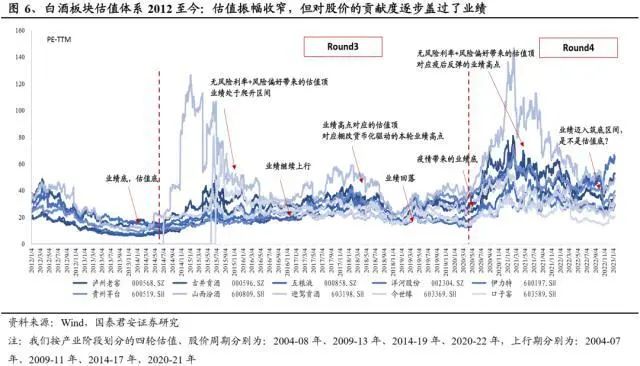 中期维度,估值的权重有望继续提升,新周期股价空间或大于业绩弹性。从全阶段(上行期+下行期)的视角看,2004年至今,白酒4轮估值、股价周期中,第三轮周期(2014-19年)的估值对股价贡献度显著高于业绩。而单纯从上行期的视角看,4轮周期中,后两轮(2014-17年、2020-21年)的估值贡献度显著高于业绩。我们认为,伴随经济进入新常态及外资持续流入,市场在估值方面对行业的业绩兑现度和持续性给予更多溢价(特别是在宽货币的环境下)。在白酒板块迈入新周期的过程中,估值对股价的贡献或继续大于业绩贡献,新周期的白酒股价空间或大于业绩弹性。