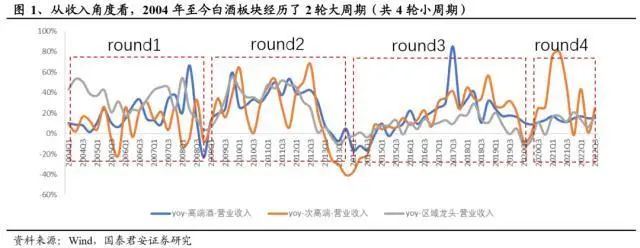 从产业视角看,以行业收入的顶底来划分,2004年以来白酒共有两轮大周期:2004-2013年的总量扩张期,以及2014-2022年的结构性增长期;每轮大周期又含有两个小周期,内部分割点分别为2008、2020年,均以经济环境剧烈波动为标志。