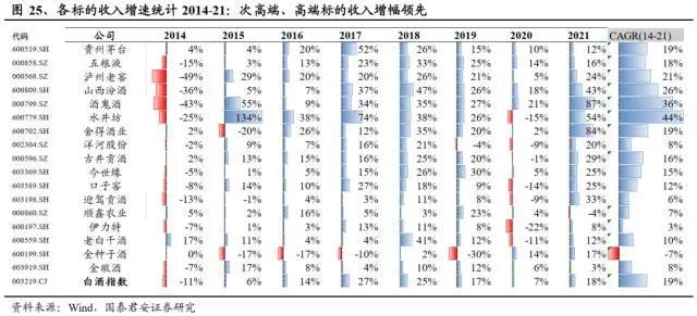 中期维度,白酒结构性增长,次高端及高端价位成长优势凸显,超额收益明显。如果将复盘的时间序列拉长至全周期(2014年至今),我们发现上轮上周期高端白酒的涨幅最多,其次是次高端价位标的,我们认为主要系本轮周期呈现明显的结构性增长,白酒需求扩张受消费升级及信用扩张支撑力度更大,高端及次高端价位产品正处风口,对应标的期间收入及利润增幅更大,成长性优势凸显。