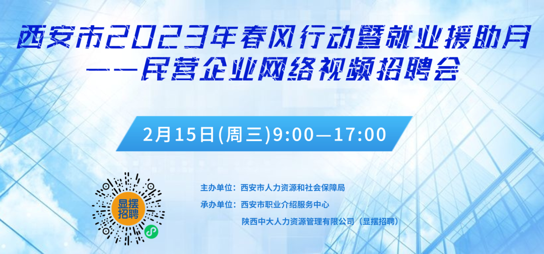 2023年2月15日,西安市职业介绍服务中心将联合陕西中大人力资源管理有限公司,举办西安市2023年春风行动暨就业援助月——民营企业网络视频招聘会,招聘会报名火热进行中!具体安排及报名方式如下: