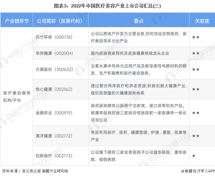 医疗美容服务平台和机构:华韩股份(430335)、瑞丽医美(02135)、新氧(SY)、朗姿股份(002612)、奥园美谷(000615)、爱尔眼科(300015)、国际医学(000516)、苏宁环球(000718)等。