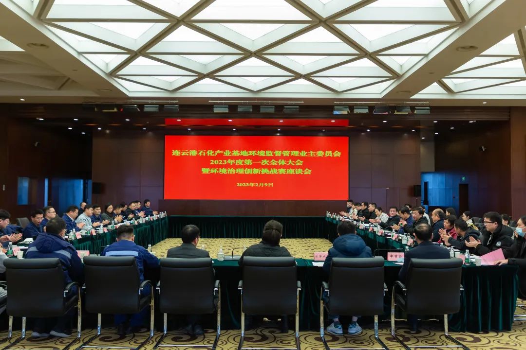 2月9日 ,连云港石化产业基地环境监督管理业主委员会在产业服务中心召开2023年度第一次全体大会暨环境治理创新挑战赛座谈会。徐圩新区党工委委员、管委会副主任卢忠宝出席会议,398大队政委张晗、环保局局长徐春生、398大队大队长刘兵、环境监督管理业主委员会主任夏志武 ,生态环境分局、应急管理局等相关职能部门负责人、全体委员单位及行业专家团队参加会议。