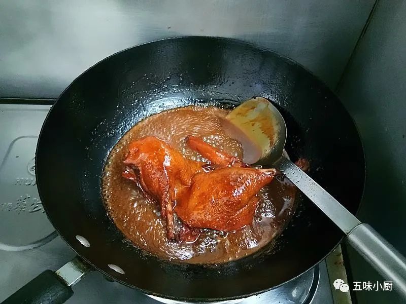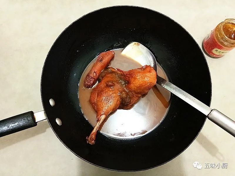 做法9、大火收汁,边收汁边用手勺把汤汁浇在鸭子上。汤汁收浓即可。(边收汁边把汤汁浇在鸭子上,会让鸭子颜色更好看,也更均匀。