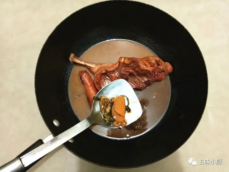 做法7、烧制汤汁减少,能用筷子轻松扎透鸭子肉厚的地方时,拣去姜片葱结等调料。(我家喜欢软烂一些的,烧制大约40分钟)