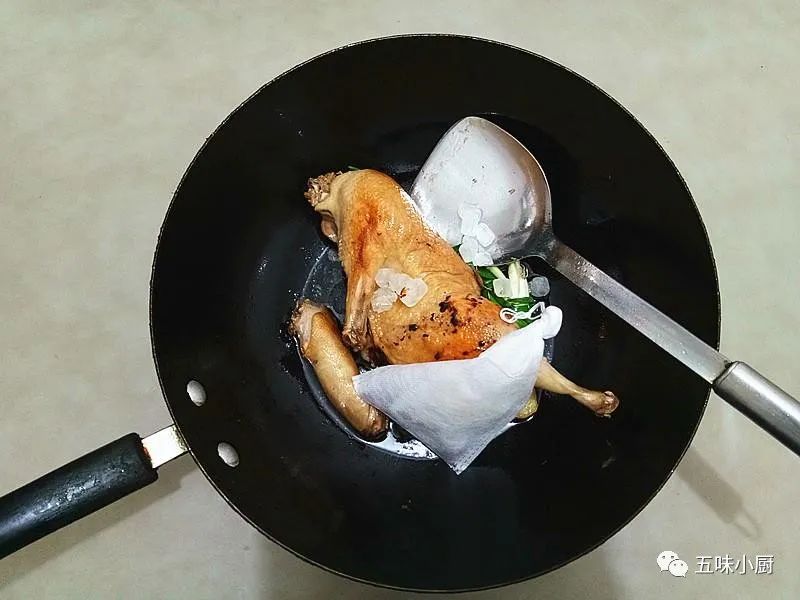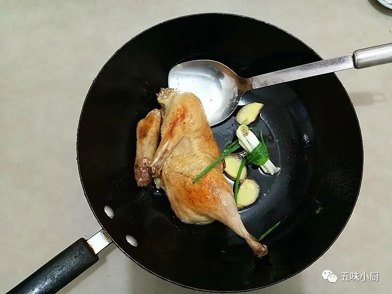 做法4、煎至表皮金黄(把煎出来的鸭油倒出来),放入姜片、葱结爆出香味。