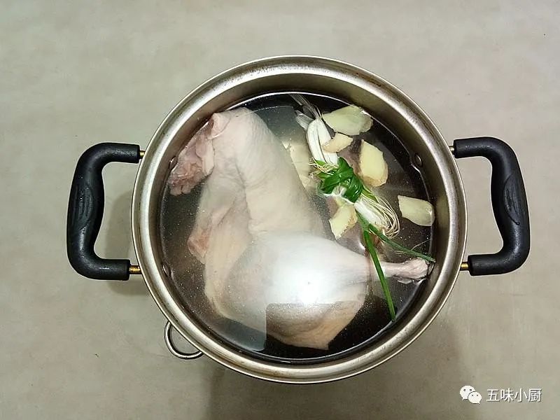 做法1、煮锅中放入足量水,鸭子冷水下锅,放入葱结、姜片、白酒大火烧沸焯水