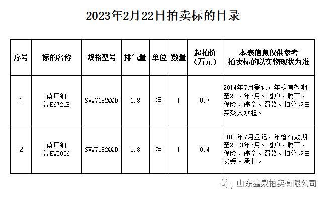 受委托,我公司定于2023年2月22日上午9:00通过我公司网络拍卖平台对以下标的依法按现状进行公开拍卖: