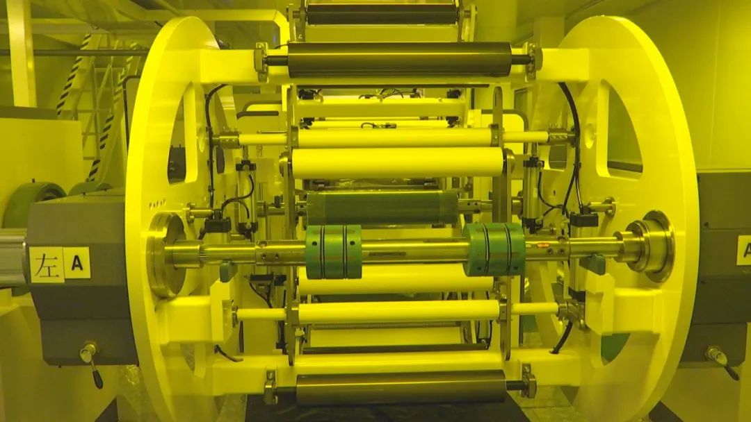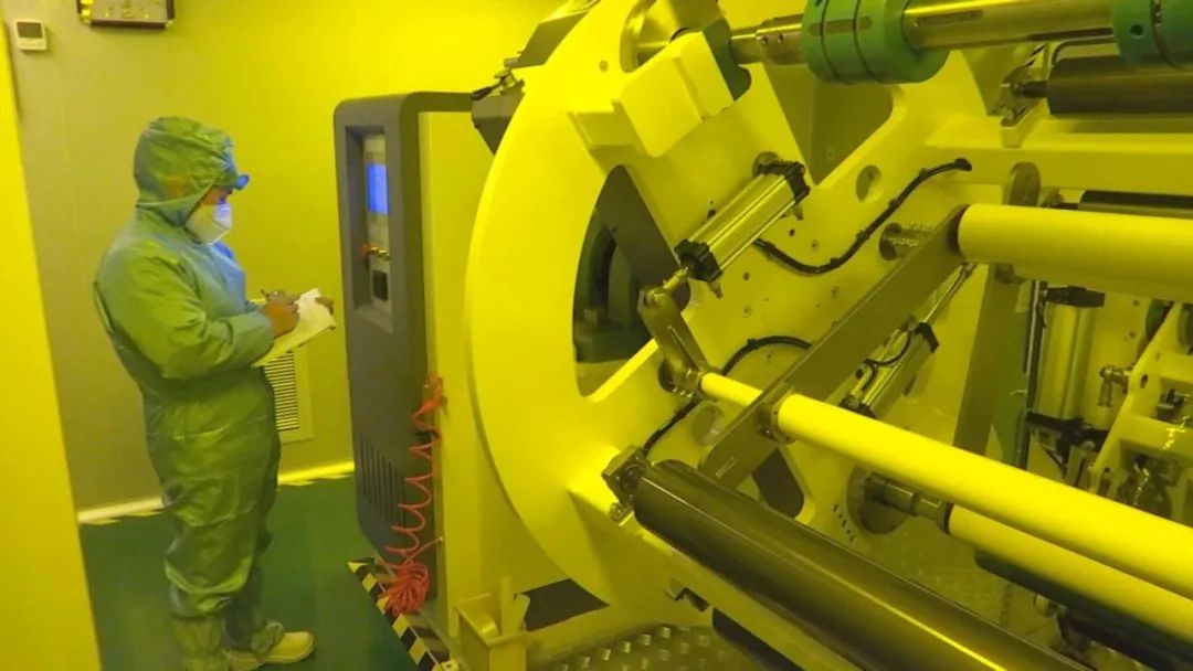 由于属于光敏型的光刻胶产品,遇到白光和紫外线等会发生化学反应,所以是黄光下生产光刻胶系列的产品。车间为千级无尘室,是国内首条生产阻焊干膜型光刻胶产品,将用在IC载板半导体封装的产品上面。