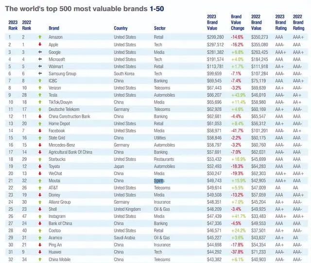 茅台以497亿美元的品牌价值登上榜单第21位,也是上榜中国品牌的第7位。在2022年的榜单中,茅台以429亿美元的品牌价值位列全球第32位,中国第13位;今年茅台品牌价值提升68亿美元,全球排名跃升11位。