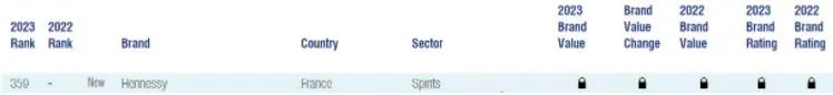 2023年全球烈酒品牌价值排行第6位的是轩尼诗,在2023全球品牌价值500强榜中排行359位。