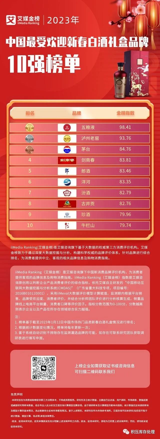 iiMedia Ranking(艾媒金榜)最新发布《2023年中国最受欢迎新春白酒礼盒品牌10强榜单》,本次榜单采用iiMeval大数据评价模型计算赋值,监测期内根据平台销售、品牌受欢迎度、消费者评价,并结合分析师团队评价进行分析核算生成,侧重品牌线上电商平台销量、消费者选择等评价因子。