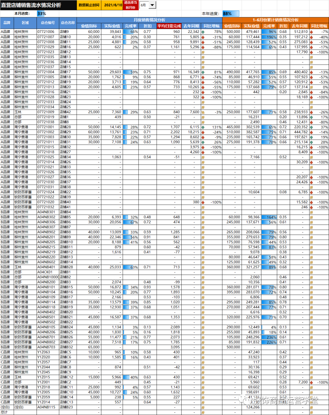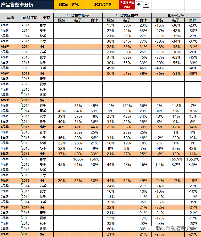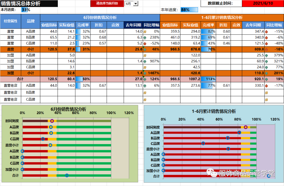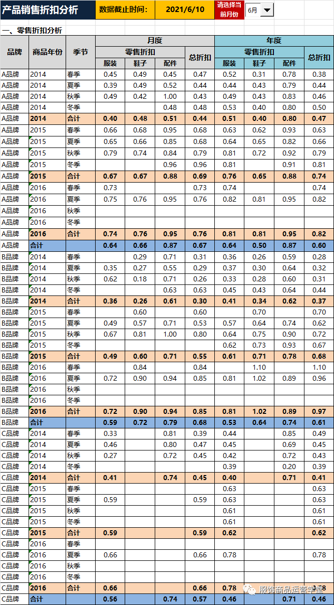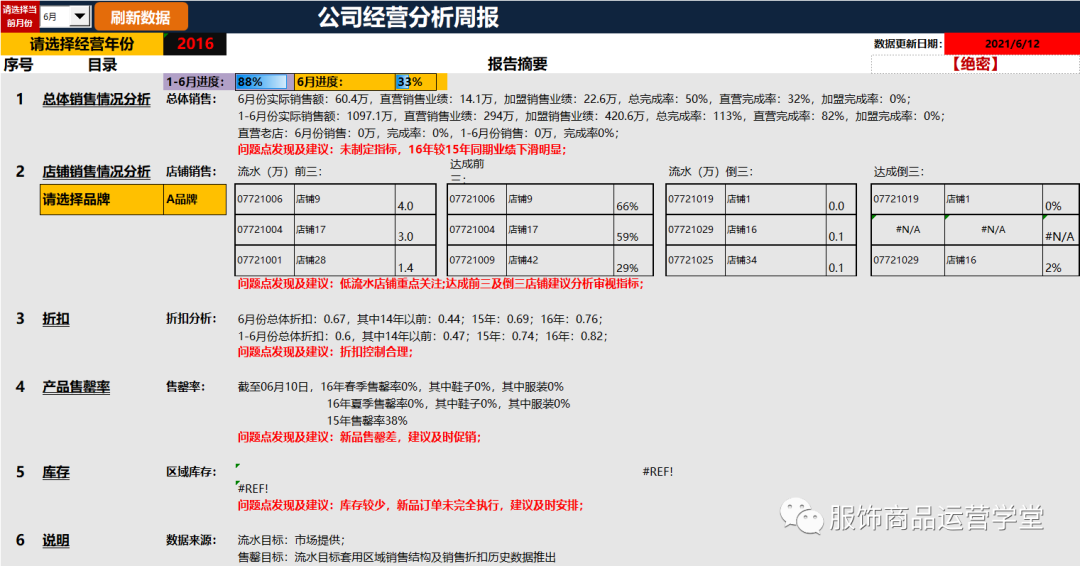 服饰公司周分析分析过程中,都要对全盘经营情况是如何,目前全年进度,月进度如何,安装现在进度是否能够完成相关目标,是否发现问题,如何解决!每个门店相关进度如何!折扣、售罄等情况怎么样!下次介绍某服饰商品运营经营分析周报模表!