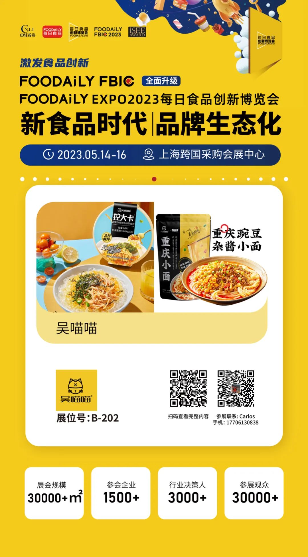 「亦珺食品科技」成立于2019年,以产品创新为导向,专注研发年轻人喜爱的好吃、好玩、好看的新奇特美味速食,凭借优异的研发能力、以及遍布全国超300+工厂强大供应链,短短3年已成功打造出4款销售额千万级的爆品。旗下拥有4个品牌:控卡轻食-「吴喵喵控大卡」、地方美食-「食货说」&「美拾派」、休闲零食-「食货动物园」。其中,吴喵喵控大卡产品连续2年成为山姆的热卖大单品,2022年美拾派鲍鱼虾仁干贝粥销量约30万罐。上市3个月畅销100w+盒,销售额破千万,山姆爆卖单品;小红书爆款,黄圣依罗永浩等明星头部达人推荐1.主食为0脂低卡的纤海藻粉,甄选南纬55°靠近南极的优质野生褐藻制成,营养物质丰富,口感Q弹爽滑2.一盒藤椒鸡丝纤海藻粉小于2颗鸡蛋的热量,约含4个苹果的膳食纤维3.椒麻爽口,搭配蛋白质丰富的鲜嫩鸡丝,好吃不怕胖5.吃法新奇好玩,引发众多小红书博主分享DIY吃法山姆月销超600万元的人气王单品!每罐内含>70只鲍鱼的海鲜粥品,全国独家!超高性价比,好评如潮,回购率高1.每罐含70只精品鲍鱼,产自“鲍鱼之乡”福建,人工挑选,鲜嫩弹牙2.每罐含56粒大粒干贝。鲜扇贝取肉,大火蒸熟,晒制烘干,粒大饱满3.甄选野生海虾仁:深海捕捞,去头去壳,经自然烘干,保持原鲜海味4.精选东北五常大米-稻花香2号品种,寒地黑土滋养,颗粒饱满,米香四溢长期霸榜京东面条品类好物榜TOP2,好评率高达99%;因地道的风味和高性价比而广受消费者青睐,复购率高1.配料丰富:特添50g大份量耙豌豆和30g浓香肉酱,料足美味2.风味地道:甄选重庆特色红柱辣椒制作正宗油辣子,油而不腻,辣而不燥;3.大份量110g挂面,非油炸传统挂面工艺制作,面条劲道爽滑第八届创博会(前Foodaily FBIC全球食品饮料创新大会)由Foodaily与中国轻工企业投资发展协会联合主办,活动将围绕产品&品牌创新的从0到1,从B到C的全链路,通过会议、展览、奖项三大板块以及特别策划活动,360°立体呈现产品创新、品牌创新、行业创新以及新消费创新。媒体商务合作:Amy(微信号:13701559246);转载授权及媒体合作:Jennifer(微信号:15151447934);加入社群:Cherry(微信号:15262433826)。