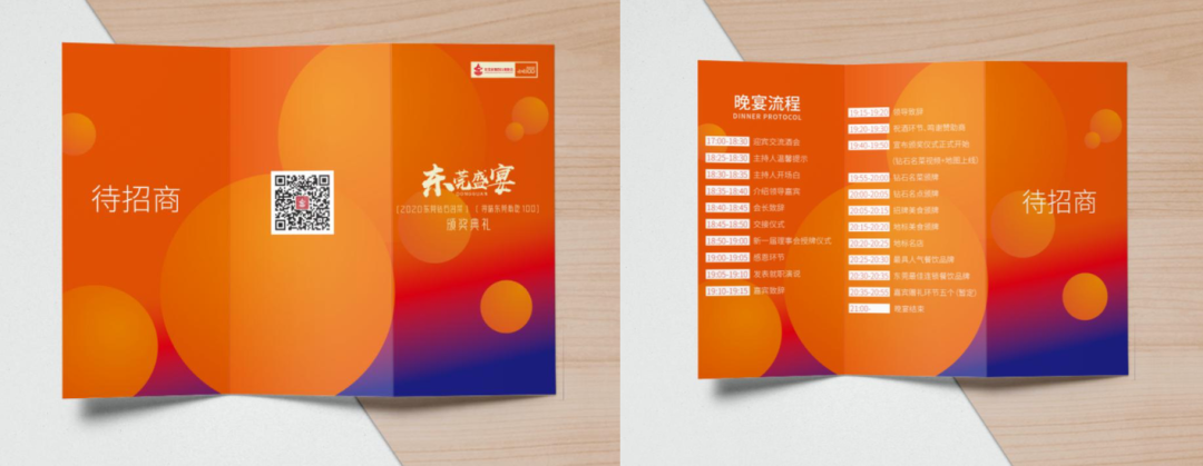 2、晚宴餐桌三折页流程卡单面广告赞助单位可获得参与东莞盛宴晚宴席位1个;