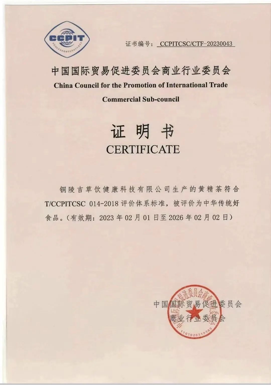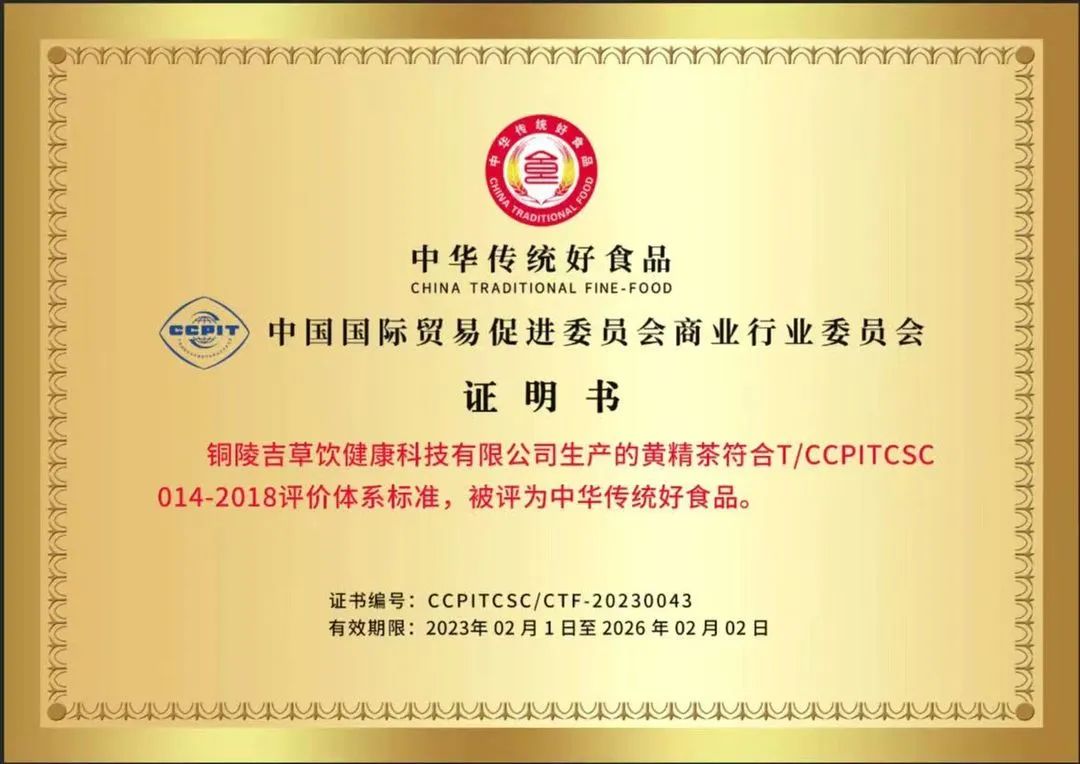 热烈祝贺——铜陵吉草饮健康科技有限公司产品被评为“中华传统好食品”荣誉称号