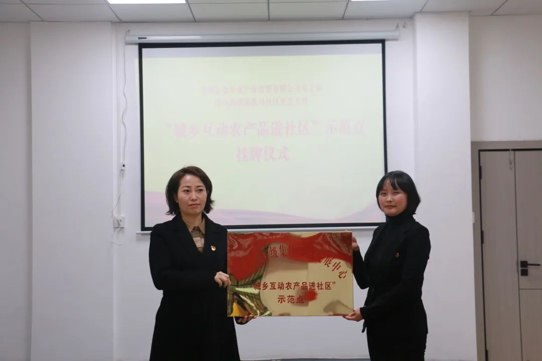 区农投公司党支部组织委员、副总经理罗晓琴为支部共建“城乡互动农产品进社区”示范点挂牌。