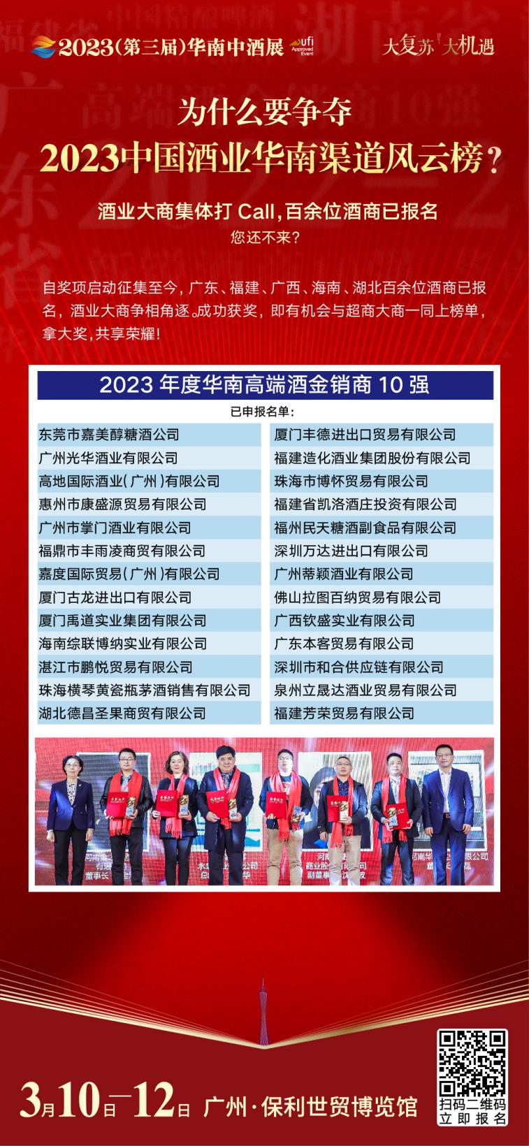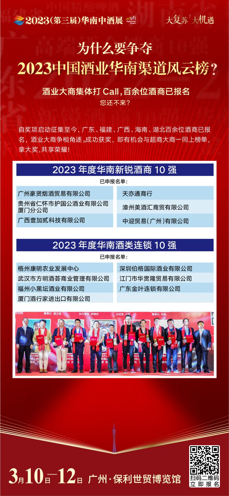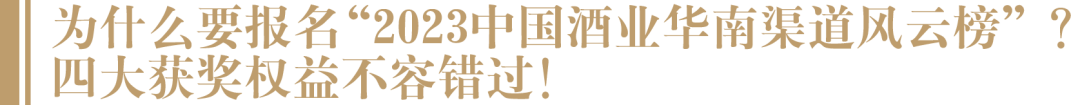 奖项征集倒计时10天!“2023年度华南高端酒金销商10强”、“2023年度华南新锐酒商10强”、“2023年度华南酒类连锁10强”,三项大奖最终花落谁家?等待您的参与!