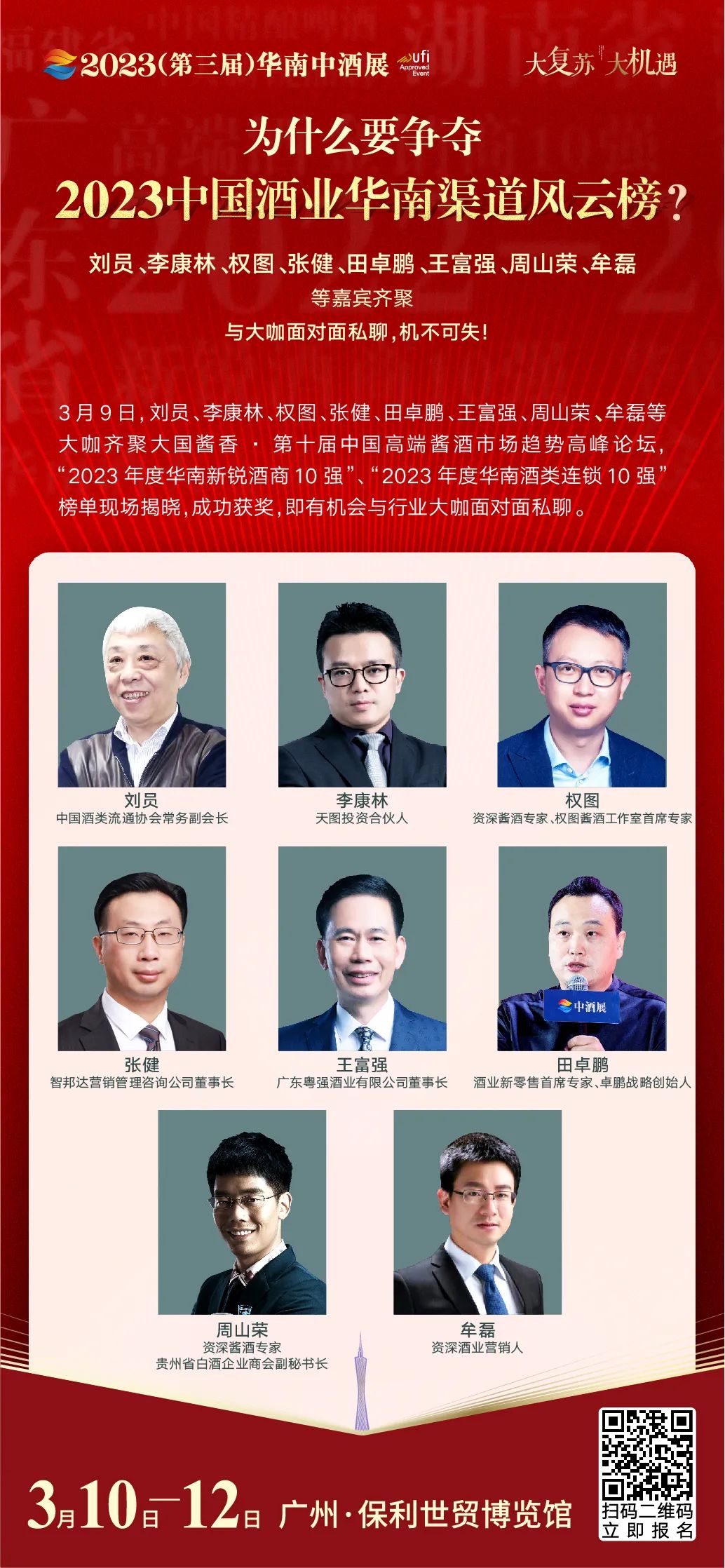 3月10日,大复苏 大机遇—2023(第三届)华南中酒展主论坛,也将在广州·南丰朗豪酒店如期举行。谁将夺得“2023年度华南高端酒金销商10强”?中国副食流通协会会长何继红,中国酒类流通协会常务副会长刘员,中国精细化管理研究所所长汪中求,知名营销专家、《营销笔记》作者小马宋,里斯战略定位咨询总监冯华青,北京正一堂战略咨询机构董事长杨光,德勤合伙人吴俊,海纳机构总经理、中国酒业协会常务理事吕咸逊等嘉宾将一同见证!