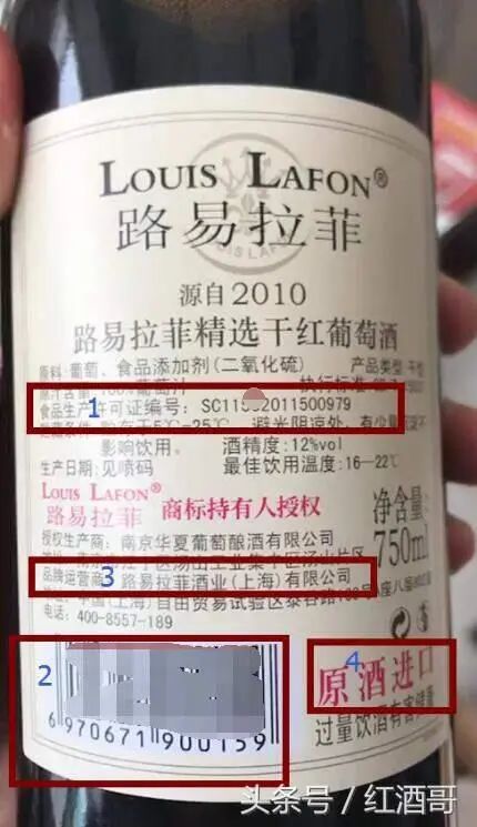 1处:只要红酒背面写有“食品生产许可证编号XXX”字样的,都是100%国内生产的;2处.条形码6开头,还记得吗?6开头代表的是中国,这个酒是国内的,并不是法国原瓶进口的,条形码3开头才是代表法国;3处:品牌运营商,上海XXX拉菲有限公司,不用解释了;4处:原酒进口,意思就是国外葡萄汁运到中国,然后在中国灌装贴标,俗称“灌装酒”,其成本那是相当相当的低,然后傍上拉菲的名气,而在中国有太多人不懂拉菲,几乎100%会以为是真拉菲,就好比国内那啥运动品牌,阿迪王,乔丹体育?你懂的。