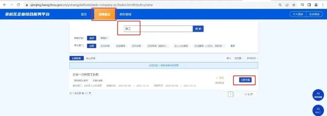符合上述条件的企业可以自2月9日起在余杭区企业综合服务平台(https://qinqing.hangzhou.gov.cn/yuhangplatform)选择“企业登录”方式,在搜索栏搜索“企业一次性留工补助”进行申报。