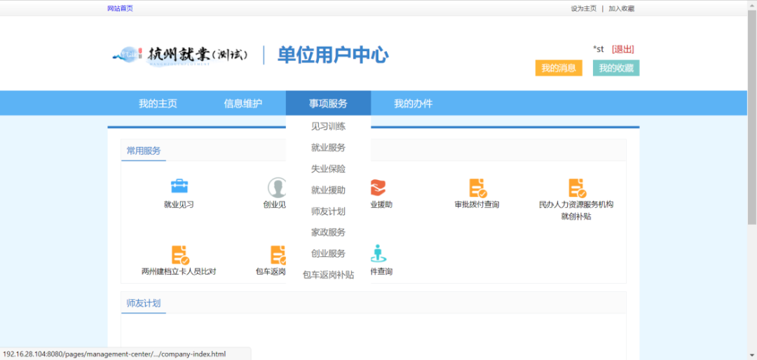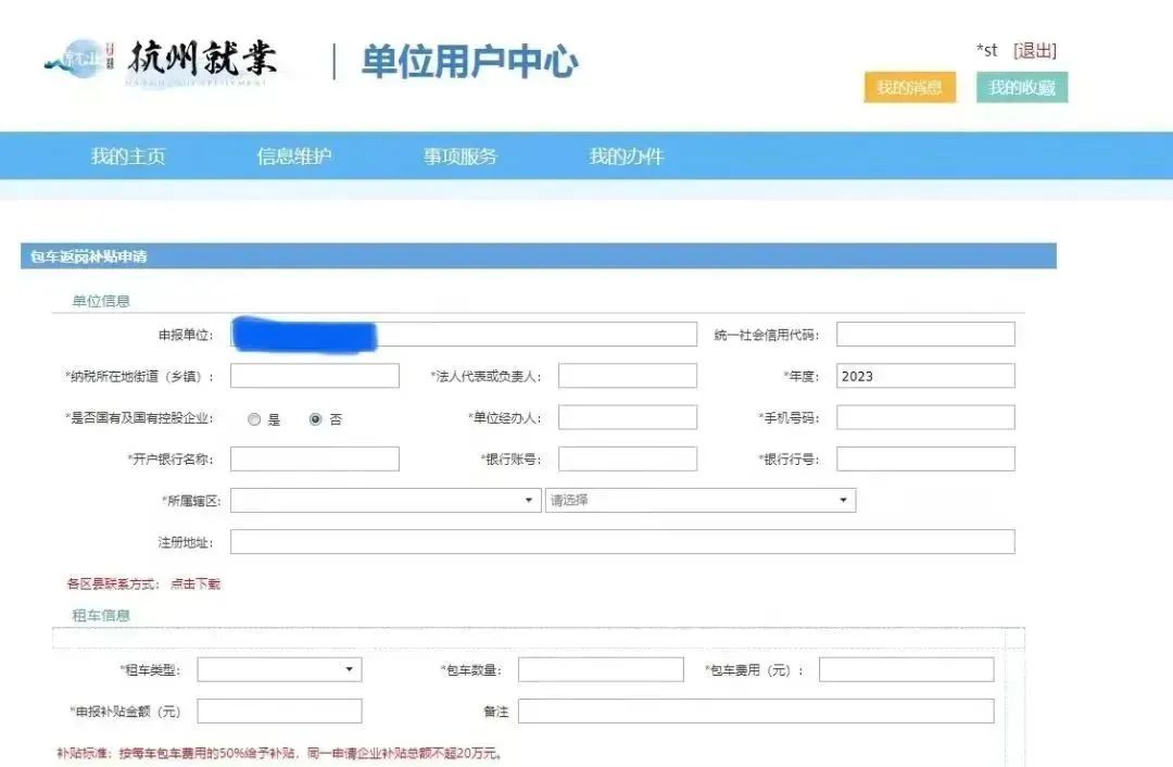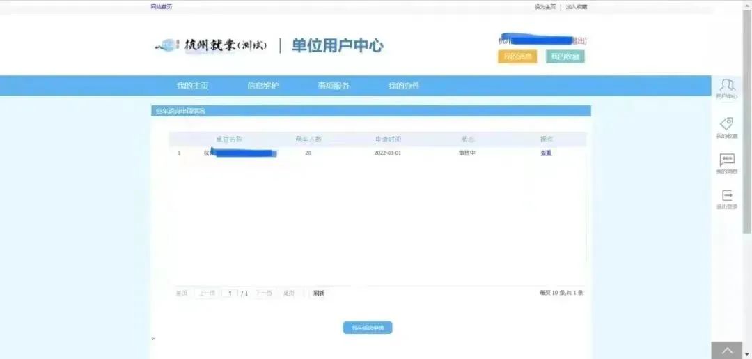 在杭州就业创业服务大厅页面找到“包车返岗补贴”,或依次点击“用户中心”-->“事项服务”-->“包车返岗补贴”。