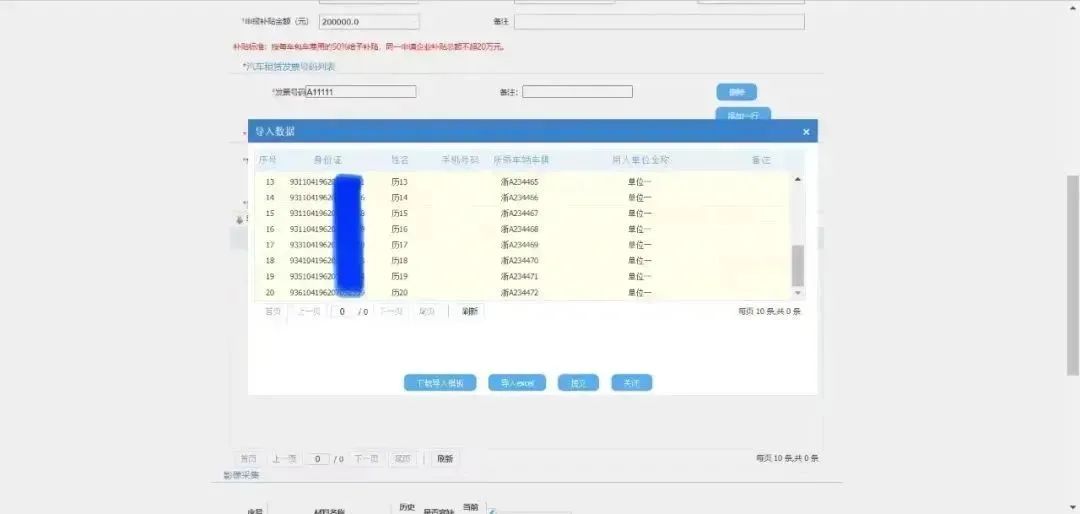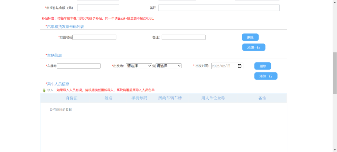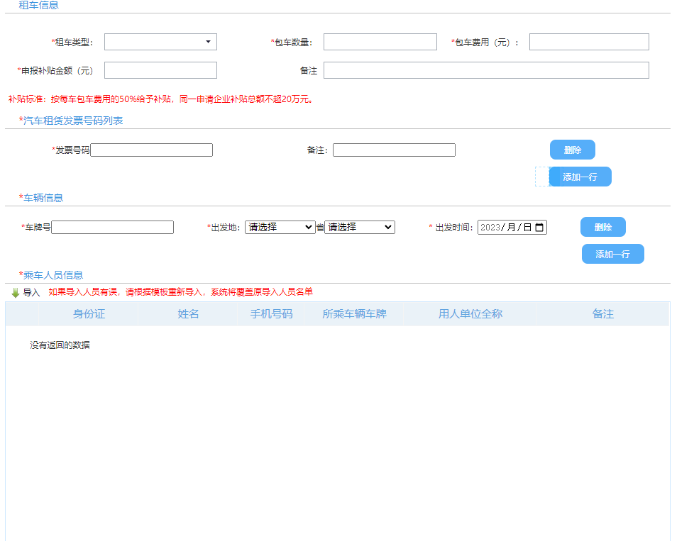 填写租车信息。填写车牌和发票时,如果涉及多个车牌或多张发票,可点击“添加一行”进行新增,不允许多个车牌或多张发票一起填写。