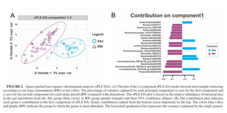 微生物组数据集包括586个分类群,而代谢组数据集由39种代谢物组成。每个数据集的第一个成分高度相关,表明每个成分对区分不同的RW组和戒酒组具有很高的区分力,相关指数为0.85。补充图5显示了第一个组分中的代谢物和分类群。