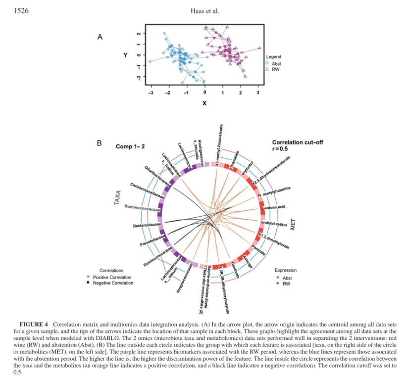 对于随机选择的20名患者,我们使用Diablo平台的多重组学集成数据来同时识别相关和区分微生物群和血浆代谢组学特征,这些特征能够在患者队列中区分RW和酒精戒断干预。