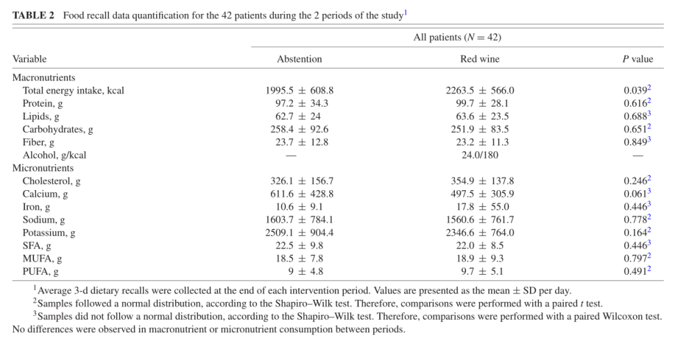 除了酒精摄入增加的热量外,在RW期间和戒酒期间的饮食记录中存在类似的膳食模式,这表明RW摄入是两组之间唯一的饮食差异。此外,尽管在RW干预期间能量增加了,但体重、腰围或血糖水平没有变化。