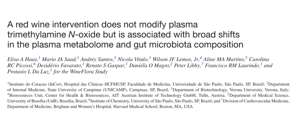 本文是由Elisa A Haas,Mario JA Saad,Andrey Santos等人联合发表在《Clinical Nutrition》上的一项研究,旨在研究服用红酒对冠状动脉粥样硬化性心脏病患者肠道微生物组成、血浆TMAO和血浆代谢组的影响。