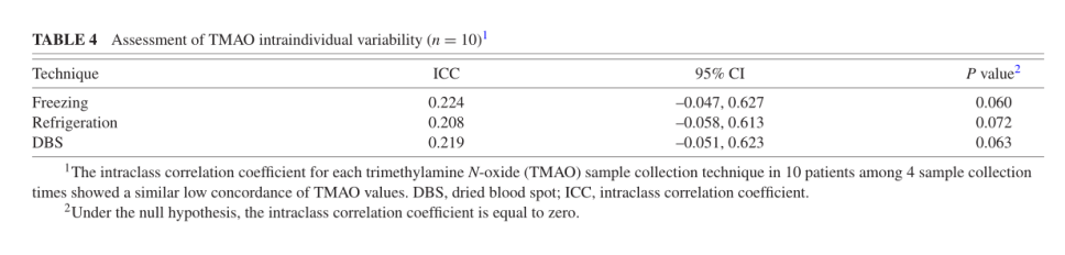 相反,TMAO的重复测量之间的一致性很低(表4),这表明同一个体随着时间的推移具有显著的测量间变异性。