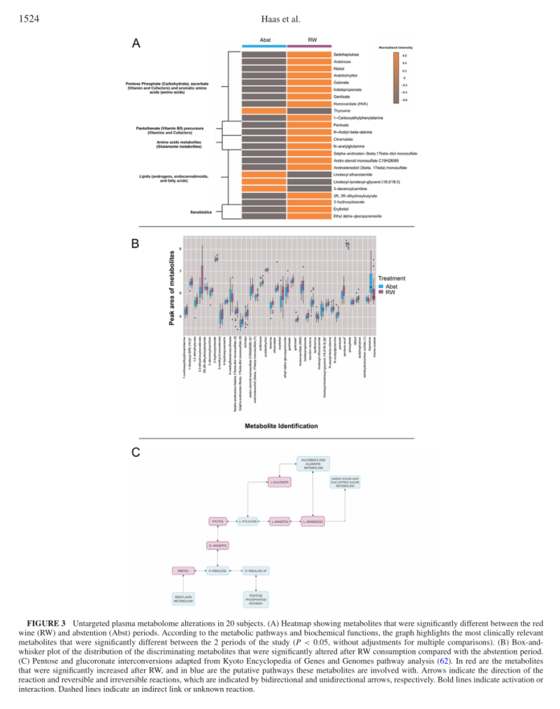 有显著变化的代谢物可能代表氨基酸、脂肪、碳水化合物、维生素和辅因子途径的变化(图3A)。通过非参数数据的配对Wilcoxon符号等级检验和参数数据的配对t检验,确定服用RW后与戒酒期间相比发生显著变化的代谢物。