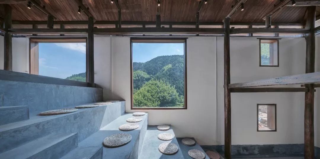 建筑二层周围被完全打通,层高更高,这也让中间的冥想室呈现一种悬空的超脱物外的虚空之感,只有一条窄窄的楼梯可供上下,独立感更加突出。四周阳光板的材料使得色调温暖而虚空,好像处于第四维的空间,让你有机会与自己对话。阅读室是二楼除了冥想室之外的唯一一个空间,通过窗户就可以窥见村落的崖居样貌。