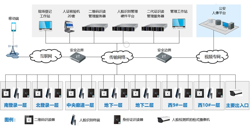 人脸识别通行系统由人脸识别闸机终端、传输网络、管理平台组成,信息网络采用TCP/IP协议通信。系统基于会展安防专网传输,为保证数据传输的实时性,单臂链路须采用光纤传输或30MB/s以上大带宽链路。
