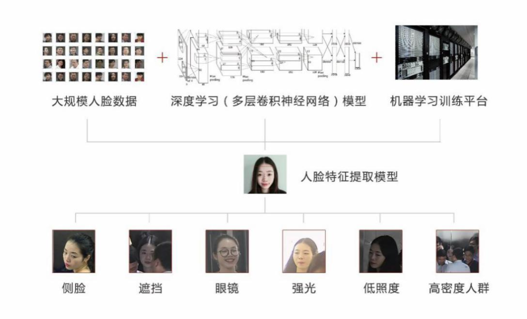 本系统采用基于机器深度学习的人脸检测算法,以及基于3D特征向量的人脸识别算法,通过精确人脸检测及特征点定位、人脸角度估计、人脸3D特征向量模型,以及人脸3D变换和低失真变形,将目标人脸与样本人脸特征向量对齐,提高比对精度,从而有效提高在各种复杂环境下的人脸识别效果。