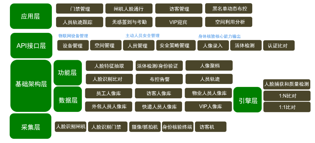 人脸识别系统包含采集层、基础架构层、接口层及应用层这四层架构。采集层包括人脸识别终端等,基础架构层包括人脸特征抽取、活体检测、人脸识别比对等;API接口层包括设备管理、人员管理、策略管理等;应用层实现闸机人脸通行、黑名单布控等功能。