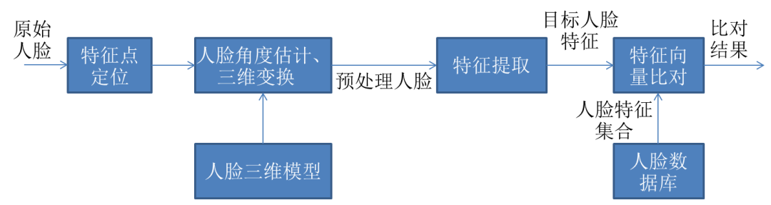 (6)采用基于机器深度习的人脸检测算法和基于三维特征向量的人脸识别算法,通过精确的人脸检测及特征点定位、人脸的三维特征向量模型、人脸角度估计,进行人脸三维变换和低失真变形,将目标人脸与样本人脸特征向量对齐,提高比对精度,从而有效提高人脸识别效果。