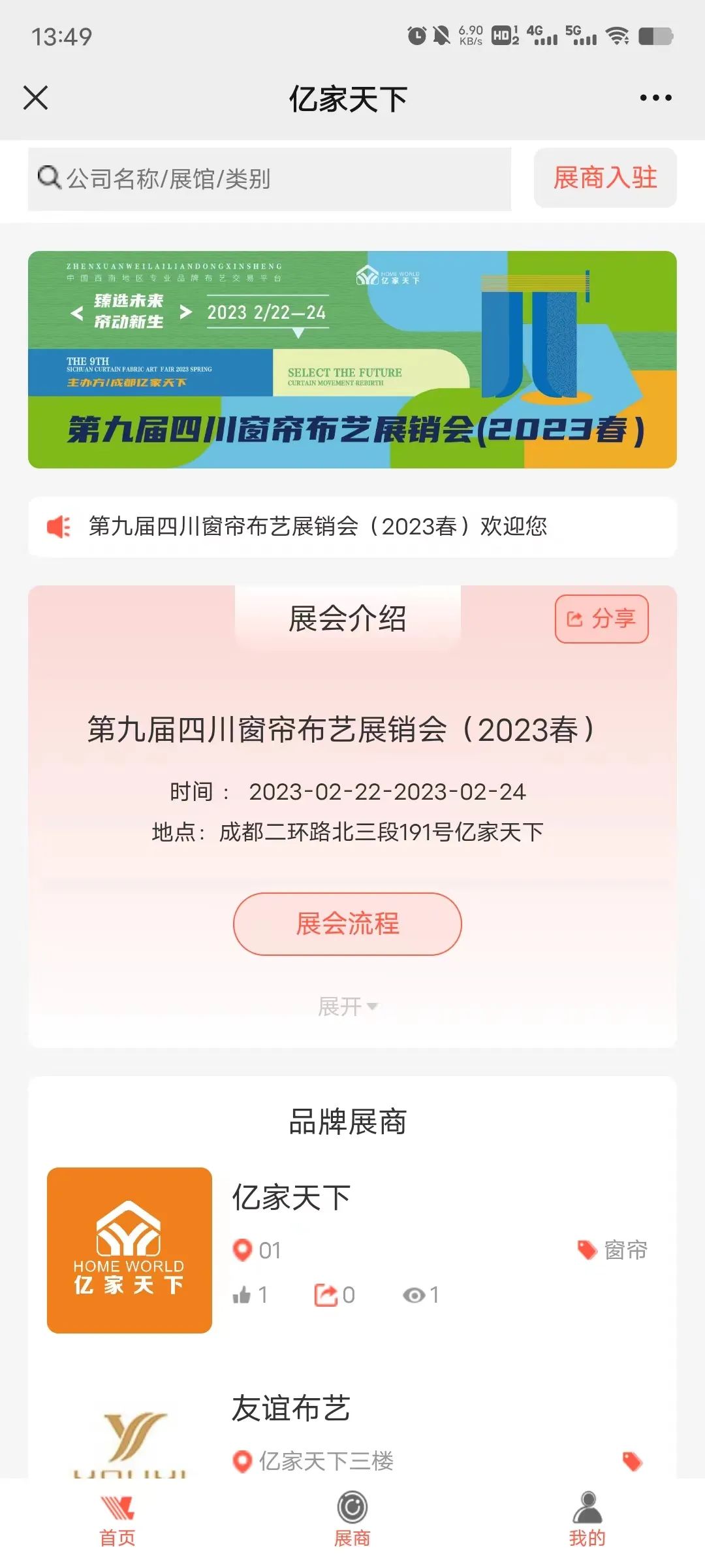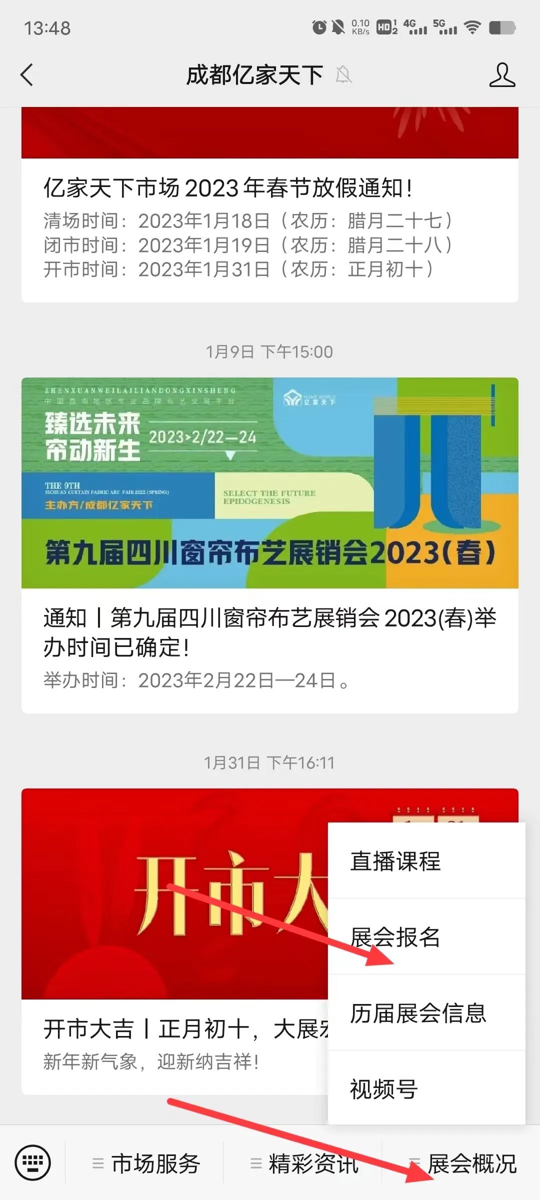 微信搜索关注“成都亿家天下”公众号,点击“展会概况”→“展会报名”,选择自己喜欢的商家报名。