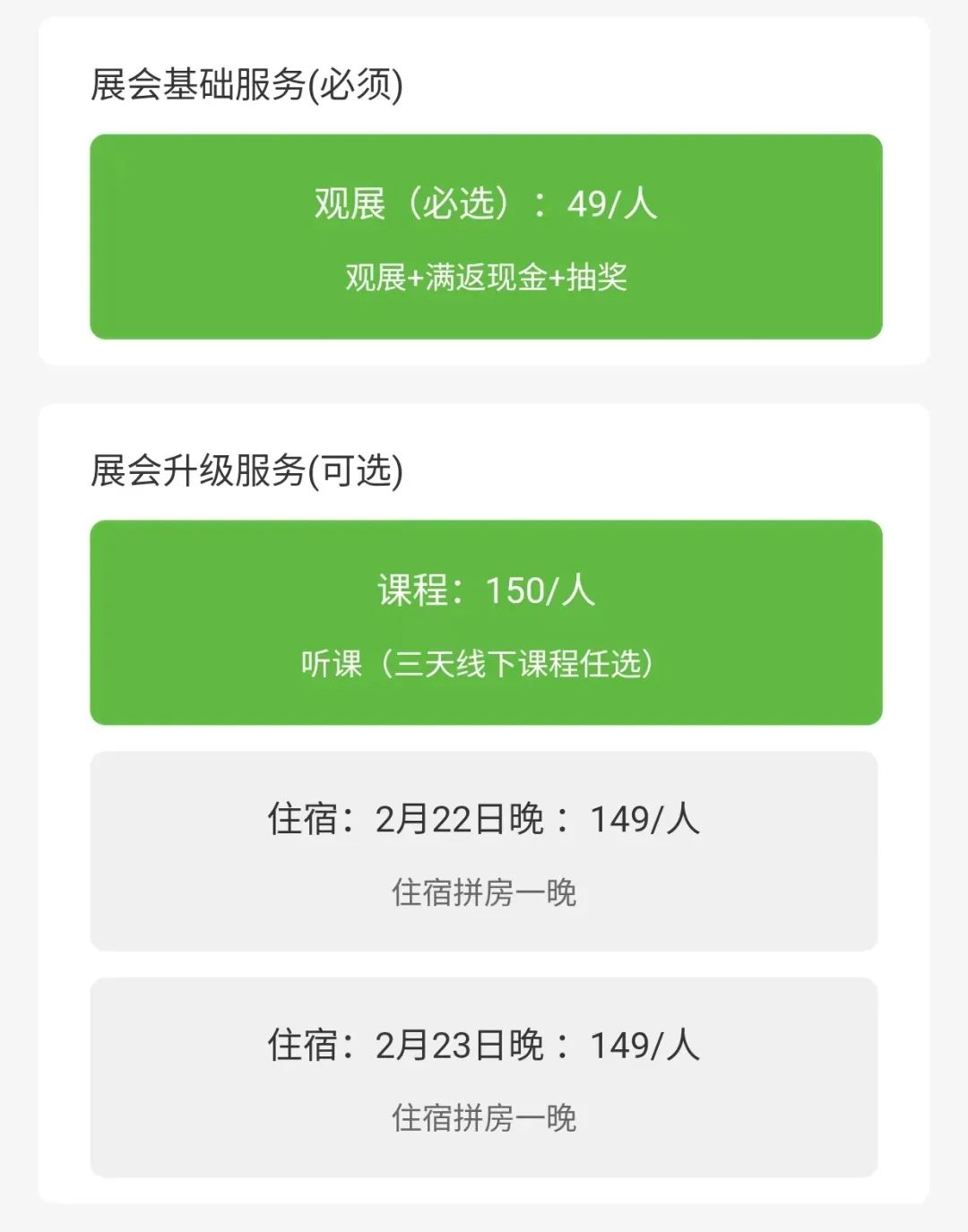 本次观展基础服务为必选项目,根据您的需求还可以选择课程、住宿等升级服务。