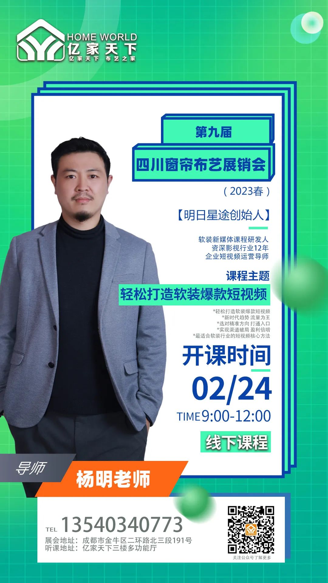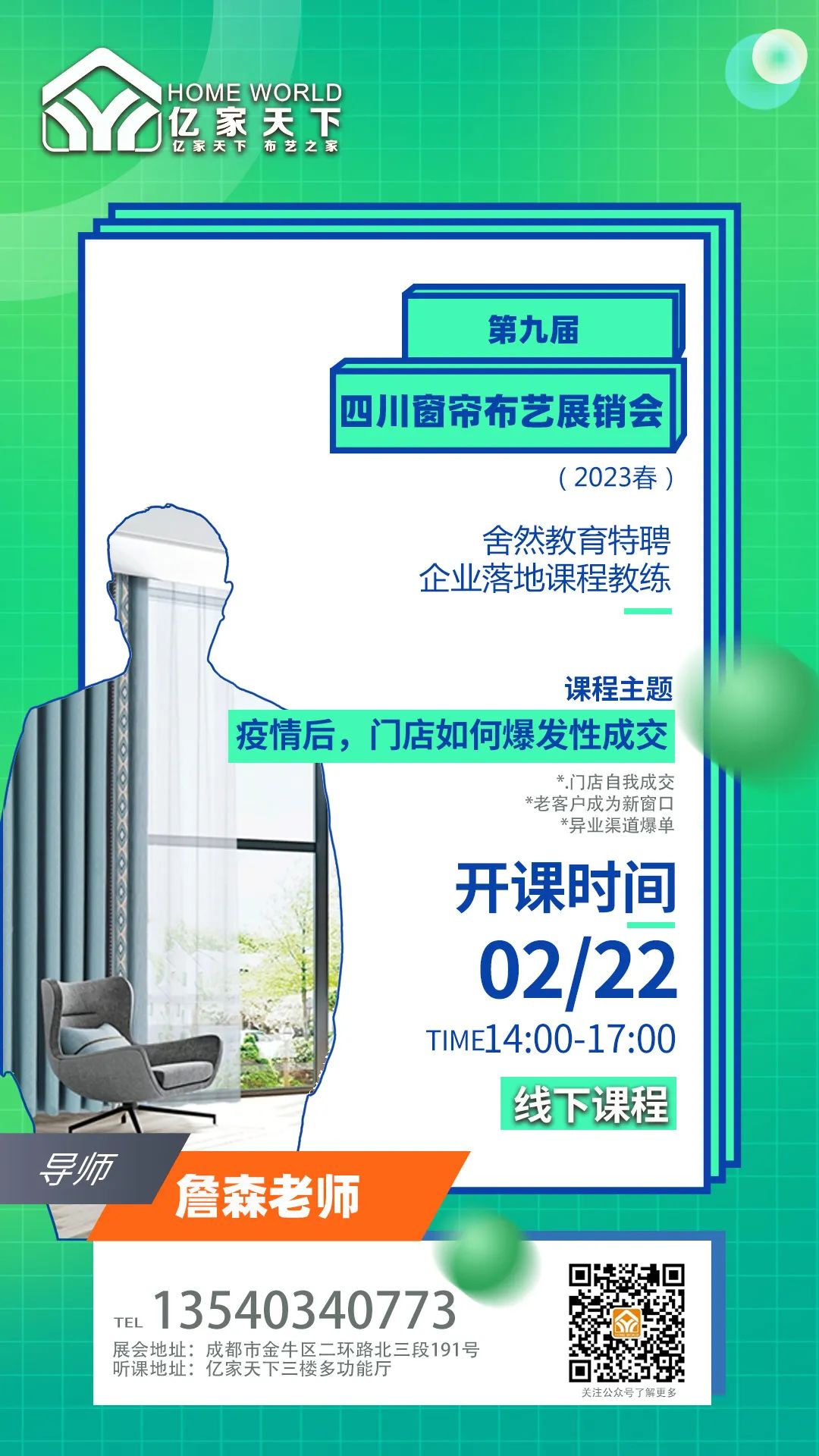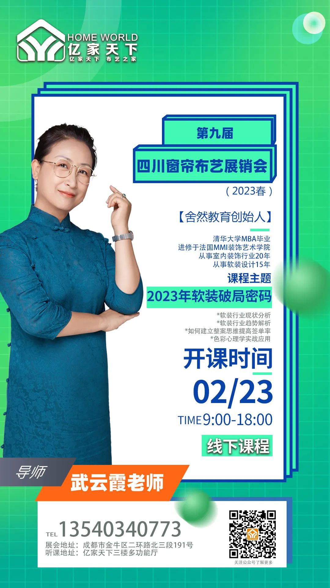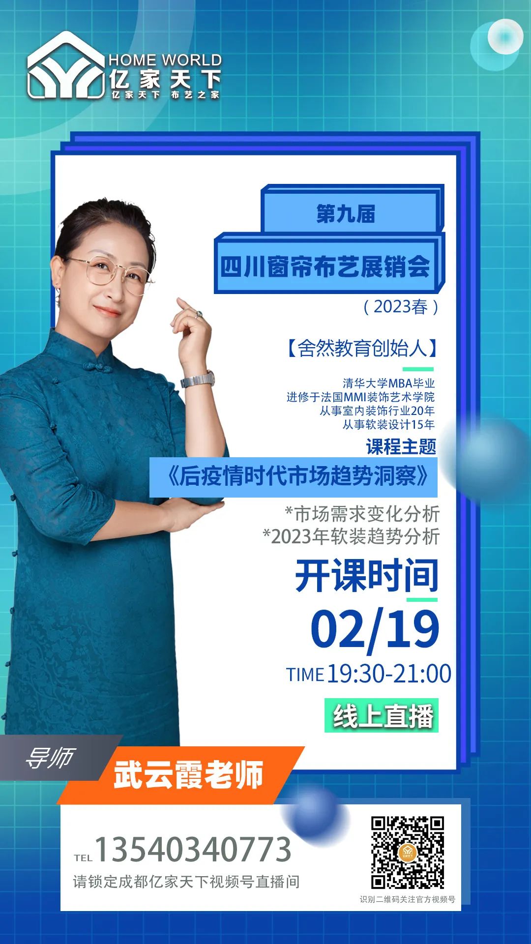 2月19、20、21日,软装行业一线导师舍然教育创始人武云霞老师、四川卫视主持人杨旭、软装博主大咖、亿家天下品牌商家花之语、环宝大狮·大自然、盛辉窗饰。连续三日在线直播,带您解读2023行业发展趋势,了解品牌塑造过程。展会选货前不可不看的行业干货直播!紧随行业风向标,掌握财富密码!
