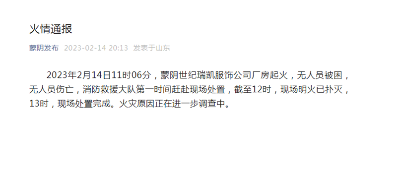 中宏网山东2月15日电 2月14日,蒙阴县官方号蒙阴发布,发布通报称:2023年2月14日11时06分,蒙阴世纪瑞凯服饰公司厂房起火,无人员被困,无人员伤亡,消防救援大队第一时间赶赴现场处置,截至12时,现场明火已扑灭,13时,现场处置完成。火灾原因正在进一步调查中。