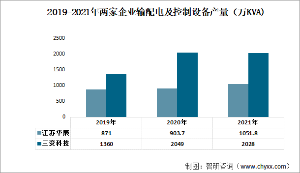 从近年来两家企业的输配电及控制设备产量来看,江苏华辰从2019年的871万KVA上升至2021年的1051.8万KVA,而三变科技从2019年的1360万KVA上升至2021年的2028万KVA。