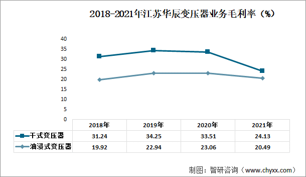 江苏华辰干式变压器业务毛利率在2018年-2020年出现上升,从31.24%上升至2020年的33.51%,而在2021年下降至24.13%。公司油浸式变压器业务也从2018年的19.92%上升至2020年的23.06%,2021年下降至20.49%。