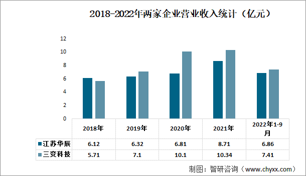 从近年来两家企业的营业收入来看,江苏华辰和三变科技呈增长的趋势,分别从2018年的6.12亿和5.71亿元上升至2021年的8.71亿元和10.34亿元。2022年1-9月,江苏华辰和三变科技营业收入分别为6.86亿和7.41亿元。