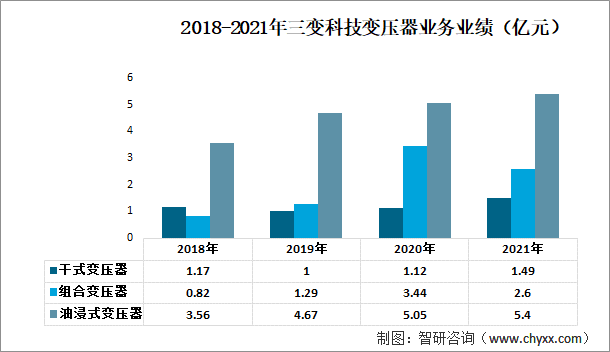三变科技的变压器业务主要分为干式变压器、组合变压器和油浸式变压器。近年来三种变压器业绩呈现上升趋势。干式变压器从2018年的1.17亿上升至2021年的1.49亿;组合变压器从2018年的0.82亿上升至2021年的2.6亿元;油浸式变压器从2018年的3.56亿上升至2021年的5.4亿元。