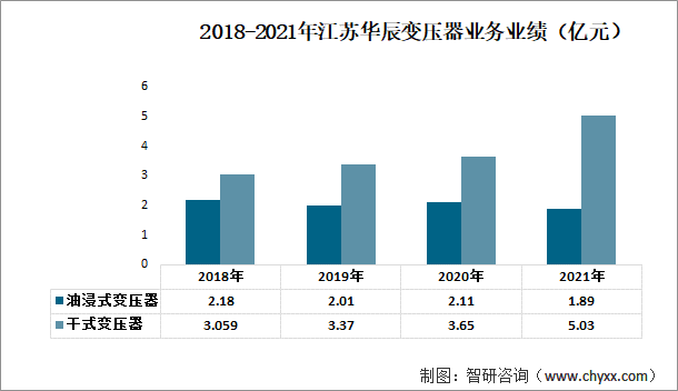 江苏华辰的主营业务为变压器业务,而变压器业务主要分为干式变压器和油浸式变压器,其中干式变压器占较大部分,2021年江苏华辰油浸式变压器业务业绩为1.89亿元,干式变压器业务业绩为5.03亿。