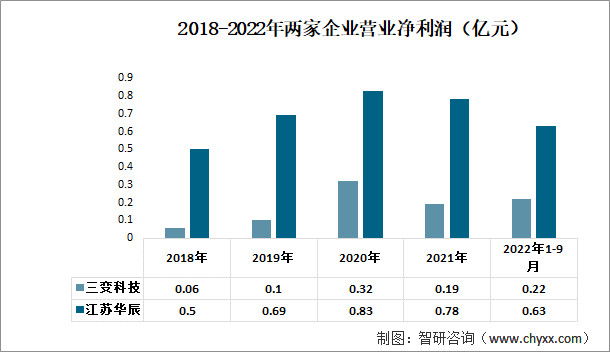 从两家企业的净利润情况来看,总体来说呈现上升趋势,并都在2021年出现净利润小幅下滑的现象,2022年1-9月,三变科技和江苏华辰的净利润分别为0.22亿和0.63亿元。
