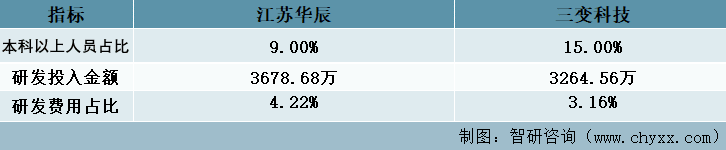 从2021年两家企业科研情况来看,三变科技本科及以上学历人员占比15%高于江苏华辰的9%,但研发金额投入占比为3.16%,低于江苏华辰的4.22%。
